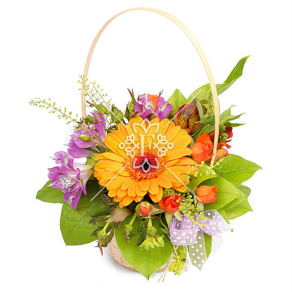 гербера жёлтая – 1 шт., роза кустовая оранжевая – 1 шт.,  альстромерия сиреневая –  1 шт., альстромерия красная – 1 шт.,  декоративная зелень, оазис, корзина малая, лента. На фото.